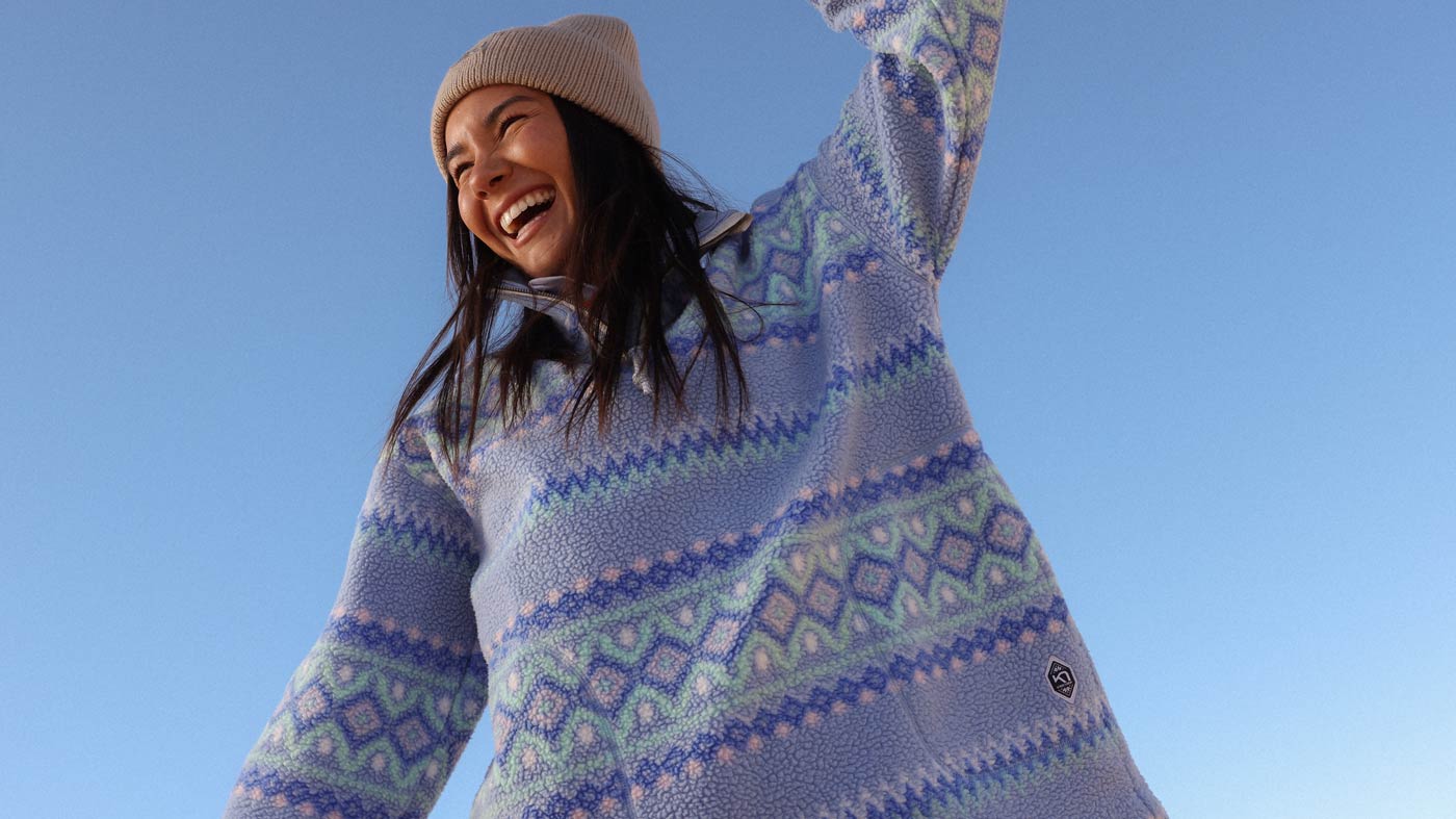 Rento ja vastuullinen valinta. Ruthie-fleece on valmistettu kierrätetystä polyesteristä, ja sen pehmeä materiaali tekevät siitä suosikin arjen seikkailuihin. Moderni kuosi on saanut inspiraationsa Pohjois-Norjan maisemista – juuri sieltä, mistä brändikin on kotoisin.